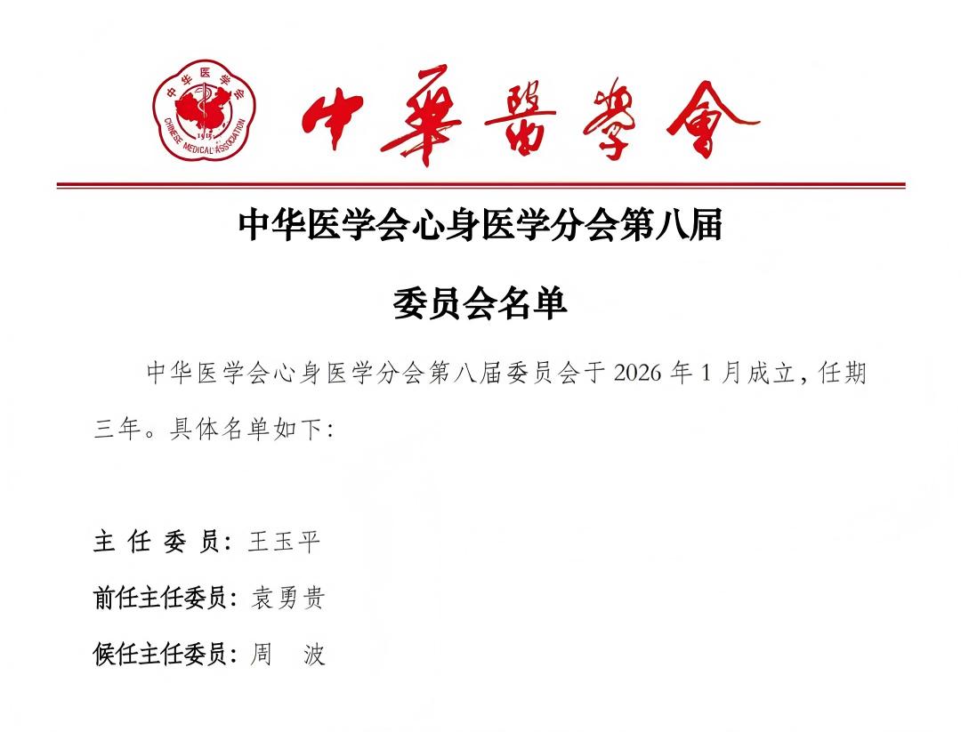 喜报!周波教授当选中华医学会心身医学分会候任主任委员